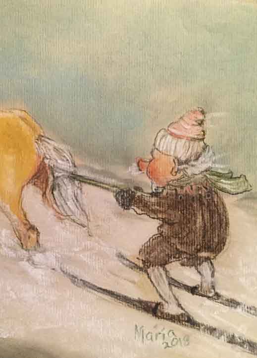 Hurðaskellir, der durch die vielen Stürze mächtig hinter seinem Zeitplan ist, reagiert sofort auf das einladende Kopfnicken des Hengstes: Schnell buddelt er seine Skier aus dem Schnee, springt hinauf und klammert sich mit aller Kraft mit einer Hand am Schweif fest, mit der anderen zeigt er dem Hengst die Richtung an.